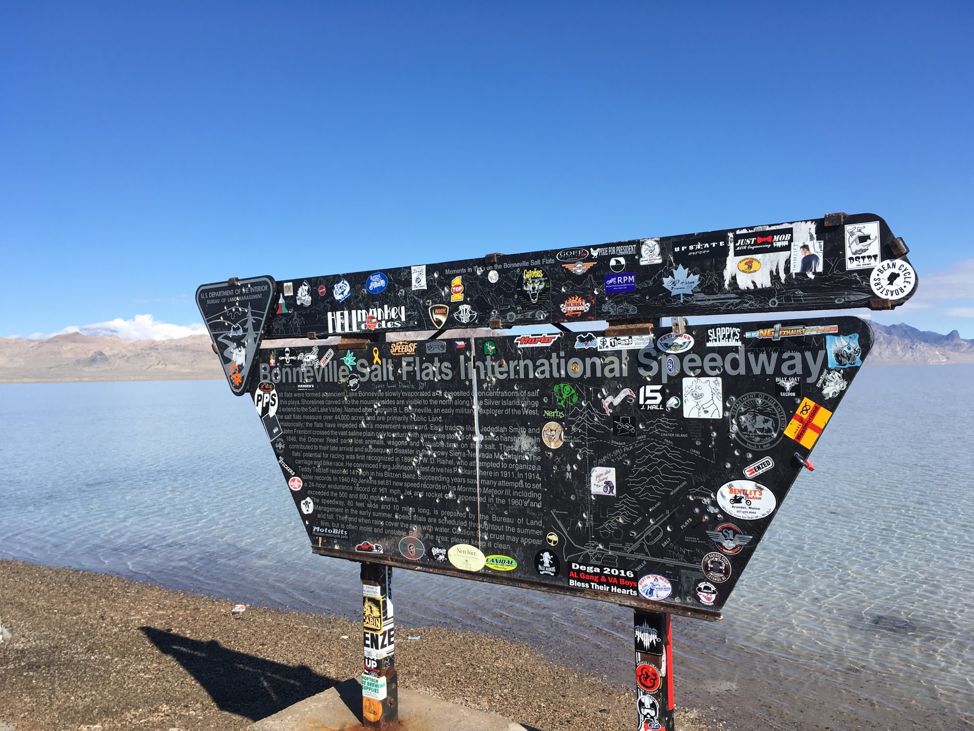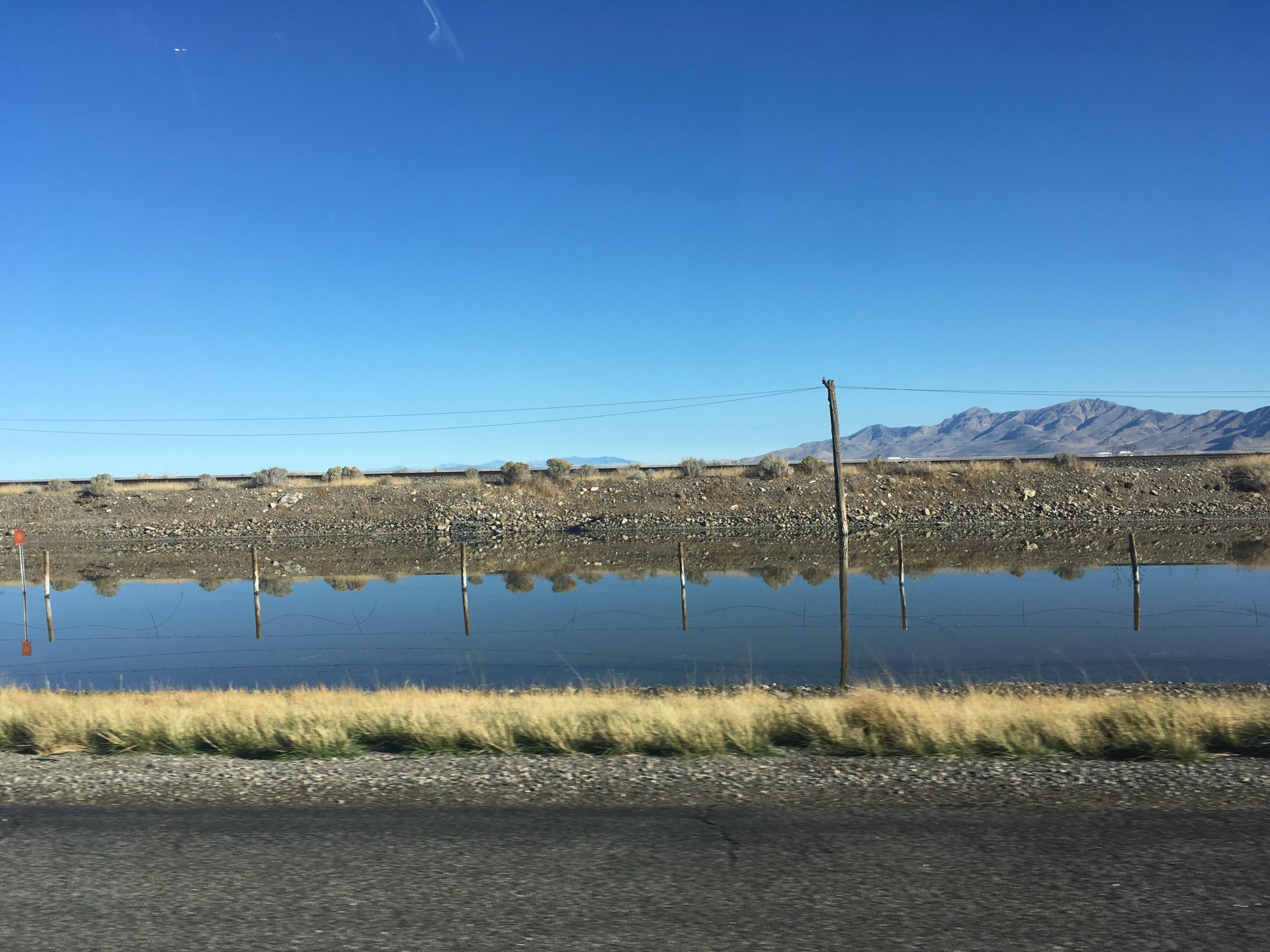 On our way to Reno we came across the Bonneville Salt Flats where a lot of the land speed records were made. A very flat and thick crust of salt covers this enormous area. The day we drove by those flats this space was covered with water. As far as you can see water only a few inches high. Unfortunately, there was wind when we arrived at the sign saying Bonneville Salt Flats. Otherwise it would have been like a gigantic mirror mirroring the mountains in the background. Let’s hope I someday return with a very nice car to drive not around but straight =)