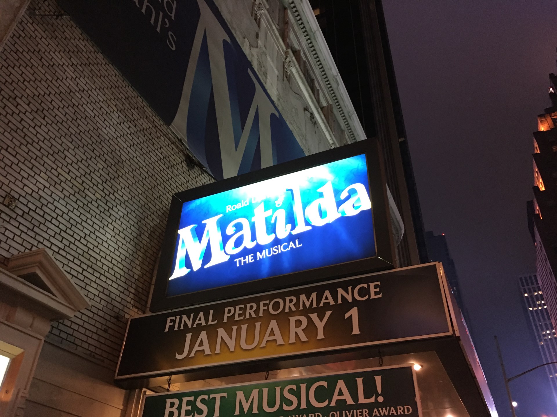 Back in the not so safe but safer area where I live I got ready for the forth night. I decided to try out another musical: Matilda. Compared with Wicked the performers at this musical weren’t quite as professional and there were a few minor flaws in their performance. But considering the age of the main actor is 9 (not the age in the story, but the actors age) she did an awesome job. In fact, all the 9 children acting on stage did an awesome job. It was a very emotional story; you could hear the sobbing through the hall. My neighbor even seemed to be crying at some point. A very well told story, worth every Cent.